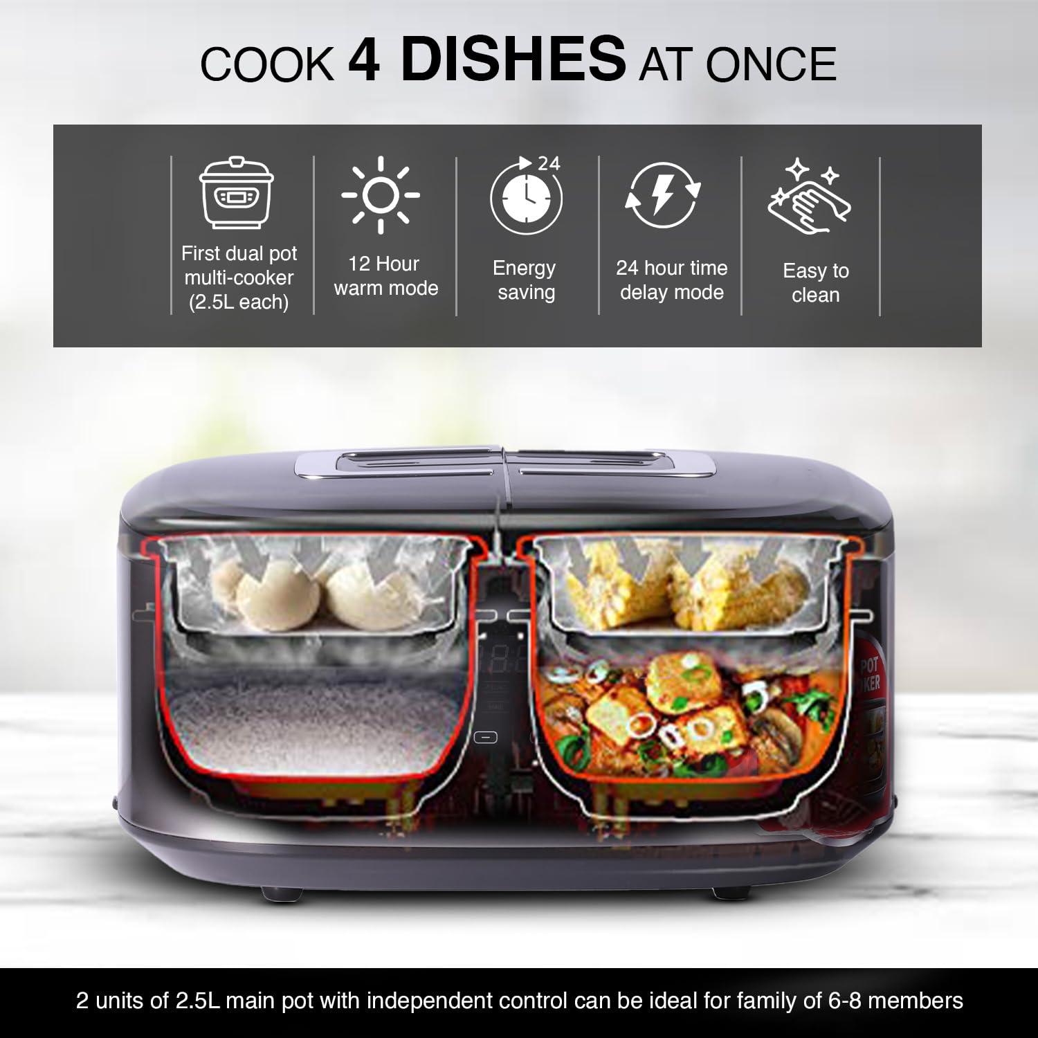 🍲 Dual Cooking Pots: Two 2.5 L non-stick pots let you cook two dishes at once