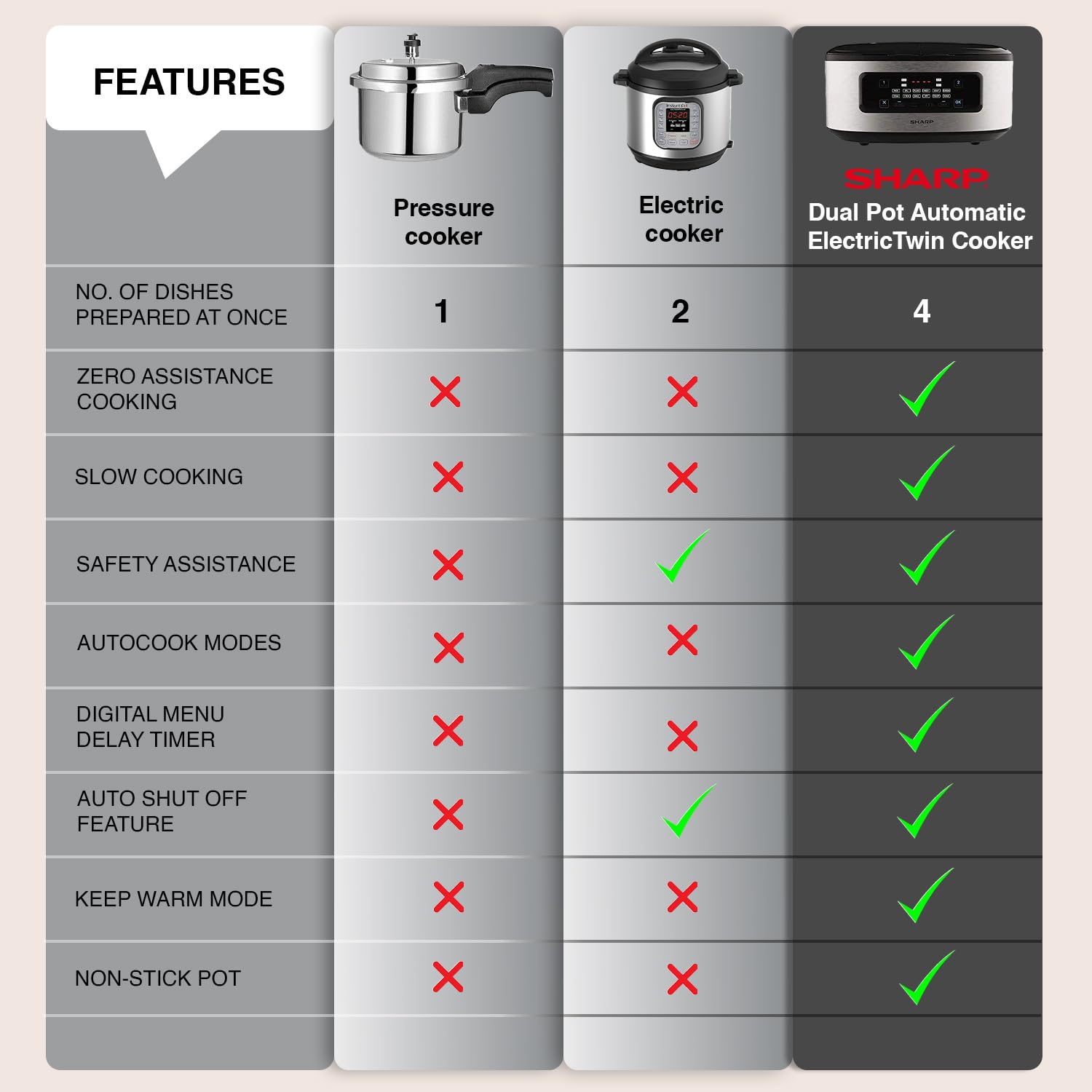 Experience versatile cooking with the SHARP KN-TC50VI-SL Twin Cooker, featuring dual 2.5L non-stick pots that allow you to prepare up to four dishes simultaneously. Equipped with 12 Auto Cooking Modes and Smart Temperature Control, this multi-cooker simplifies meal preparation, making it ideal for busy households.