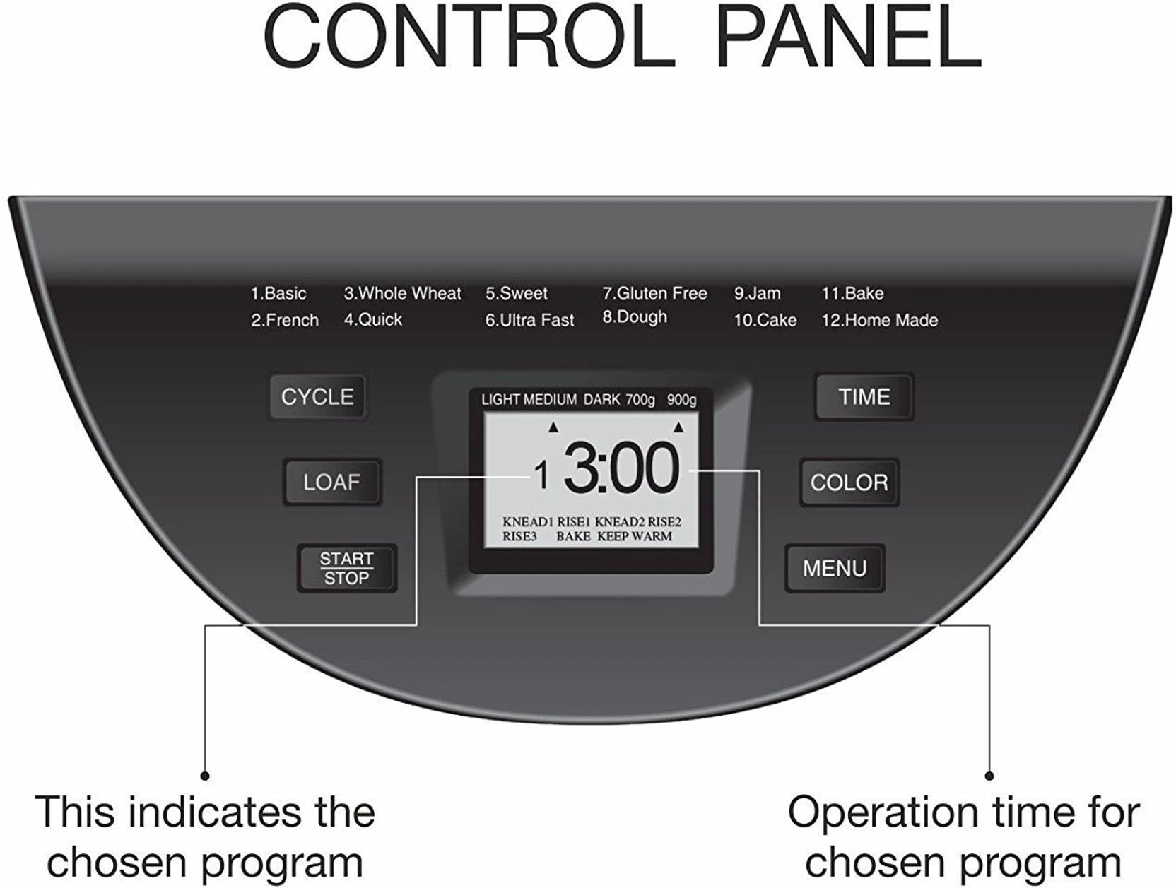 🍞 12 pre-programmed baking modes (Basic, French, Whole Wheat, Quick, Sweet, Ultra‑Fast, Gluten‑Free, Dough, Jam, Cake, Bake, Homemade)