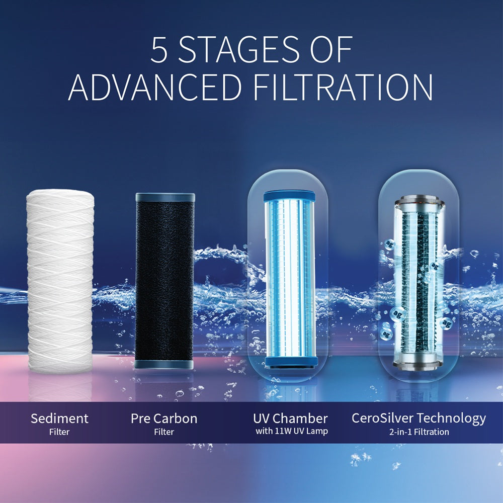 5 Stage Purification: Sediment Filter > Pre Carbon Filter > UV Chamber with 11W UV Lamp > CeroSilver Technology |